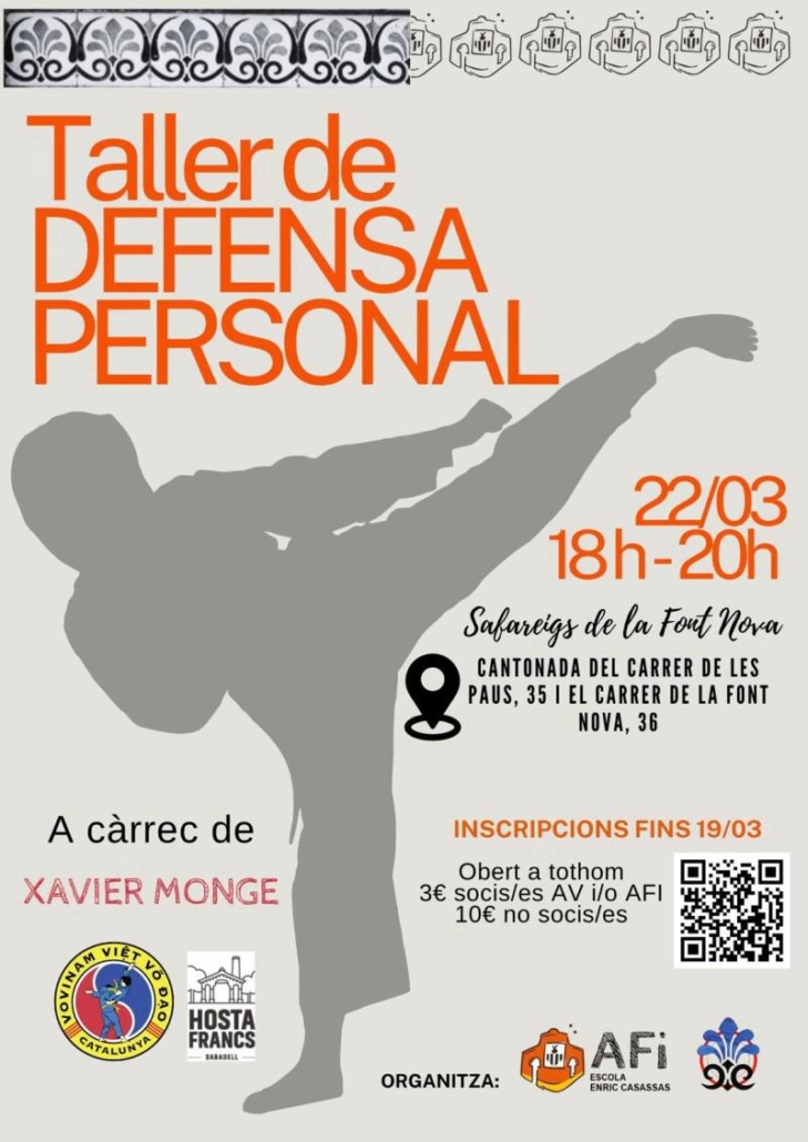 El passat diumenge 22 de març unes 12 persones van assistir al Taller de Defensa Personal que es va realitzar al Safareig del carrer de la Font Nova. Va ser una activitat organitzada conjuntament per l’AFI Enric Casassas l’Associació de Veïns dels Safareigs.